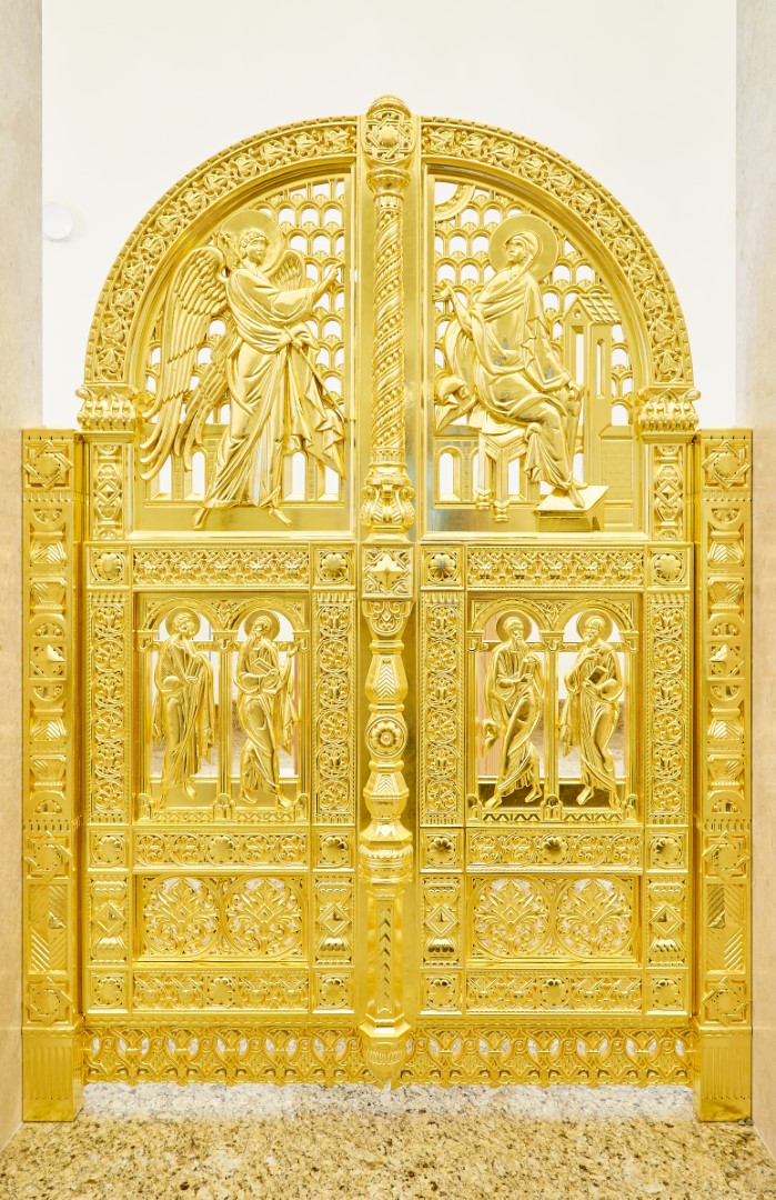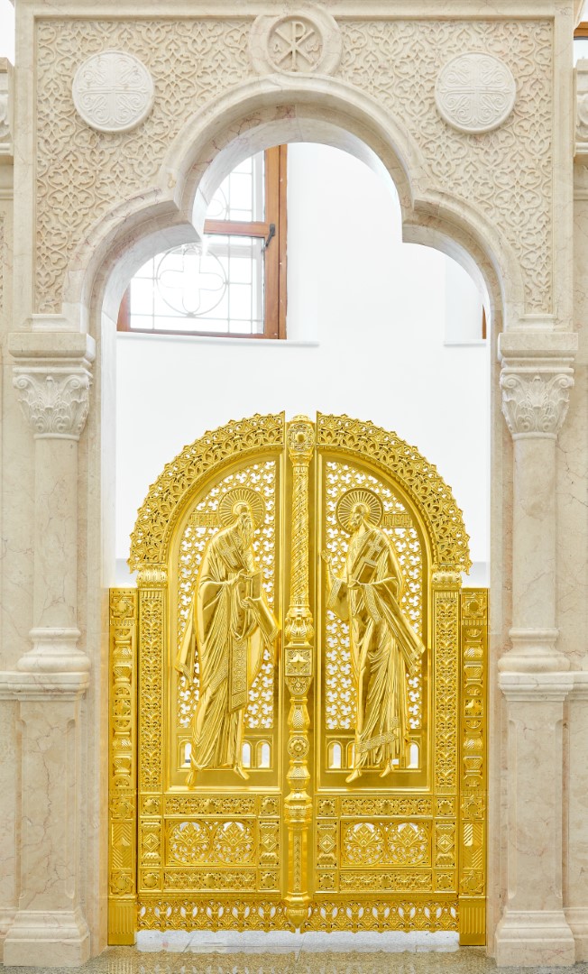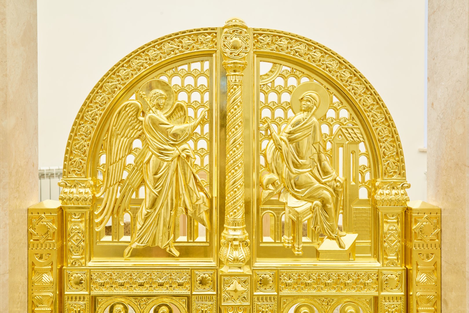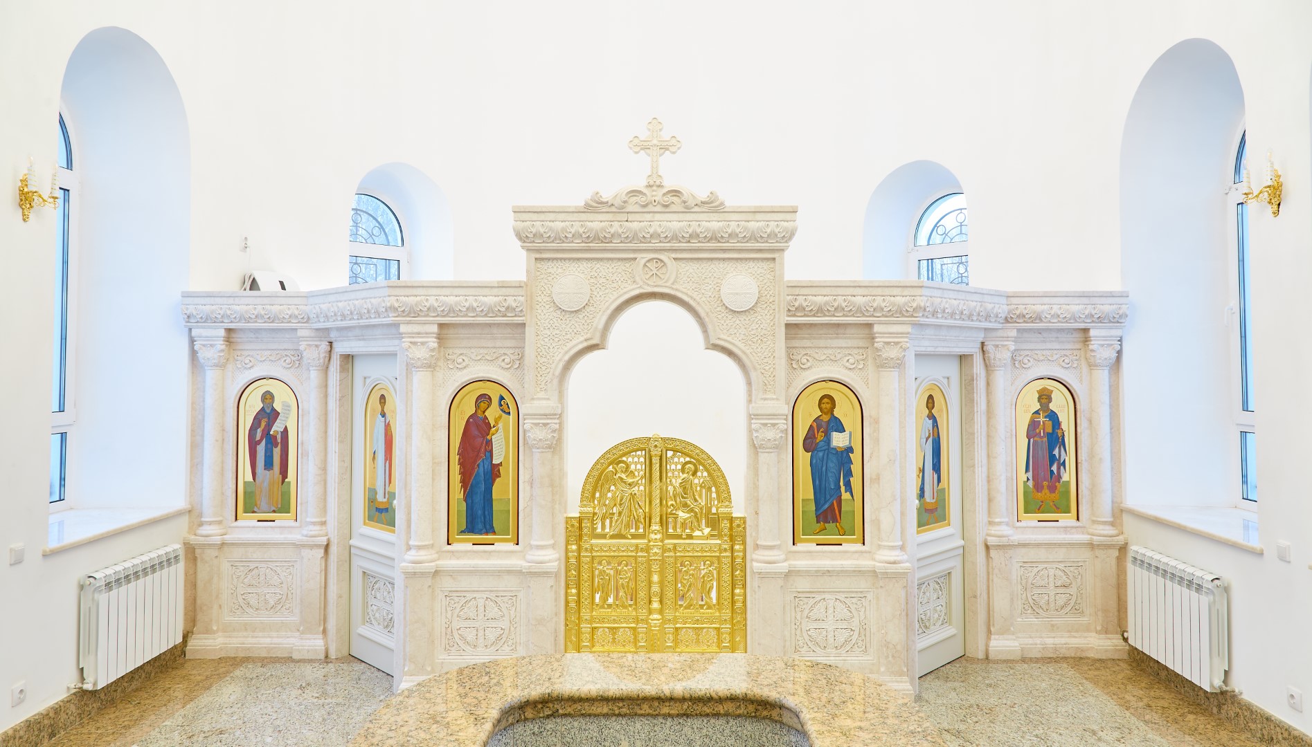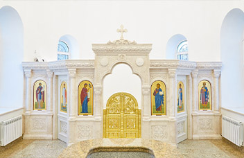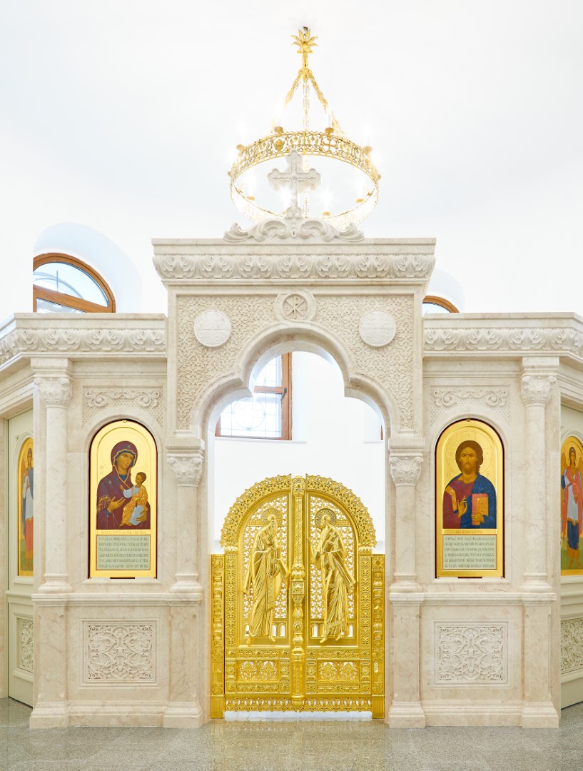 Изначально пожелание настоятеля храма было изготовить иконостас, который отличался воздушностью и прозрачностью, и давал возможность прихожанам участвовать в службе, видеть предстоятеля, и создавал ощущение единства служащего и братии. В нашей мастерской был сделан иконостас в византийском стиле, и за счет конструктивных решений мы добились визуальной легкости, которая подчеркивается сочетанием белой эмали и позолоченной басмы и резьбы.