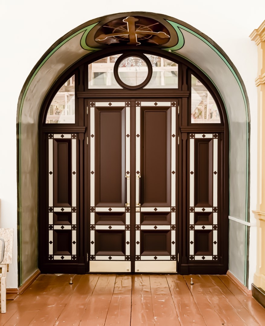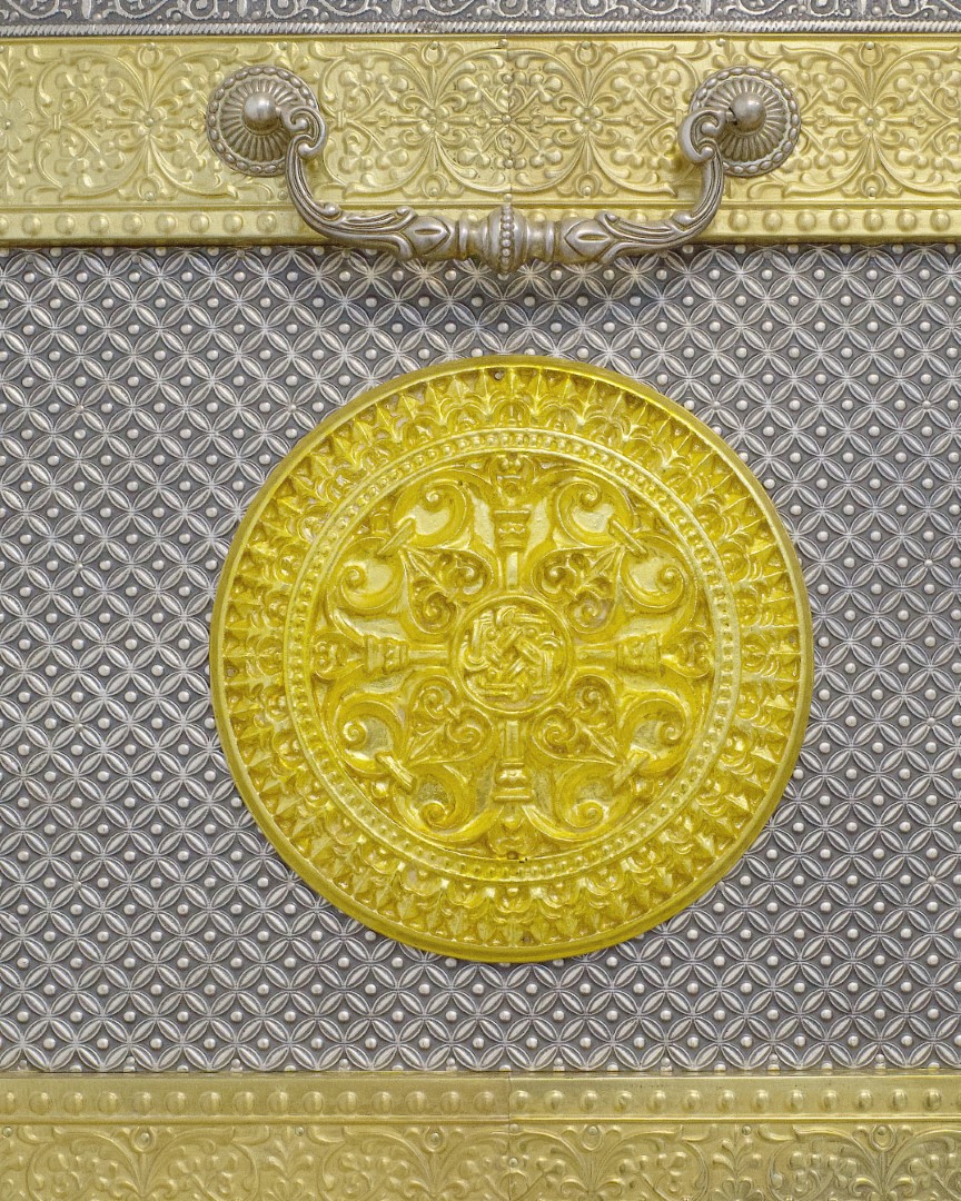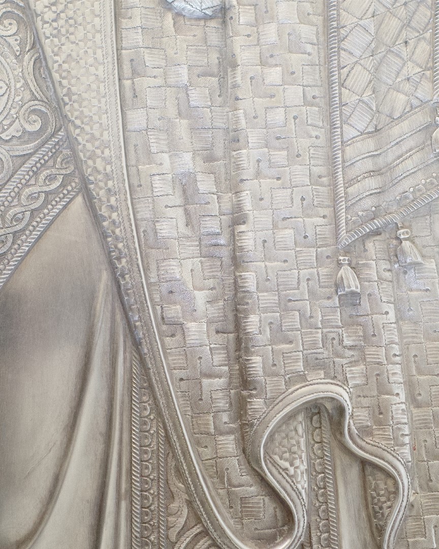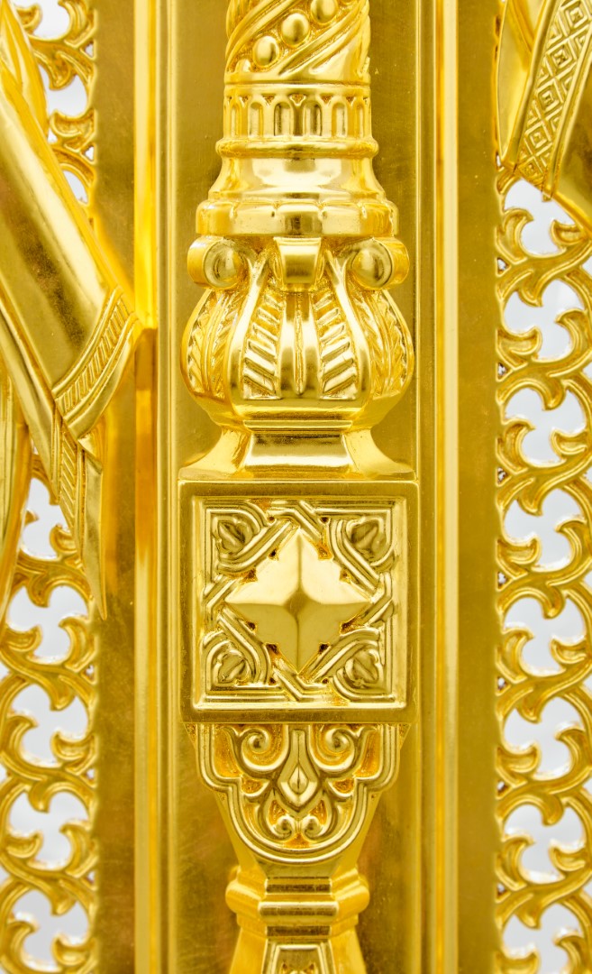 На стадии обмеров и эскизных работ стало понятно, что иконостас будет сложным в исполнении. Его форма продиктована полукруглой солеей и византийской стилистикой храма, который был построен в 18 веке. За счет неровности стен, в конструктиве появилась ассиметрия, которая, несмотря на трудности в работе, добавляет шарма итоговому образу. На стадии проекта мы решили продолжить идею византийского стиля, и его на иконостасе можно усмотреть как в орнаментике басмы, так и в формах деталей. Сложная столярная конструкция, многоскатные профиля, резьба с позолотой, около 30 метров басмы, более 15 орнаментов, все это продукт ручной работы наших мастеров на протяжении года.