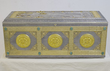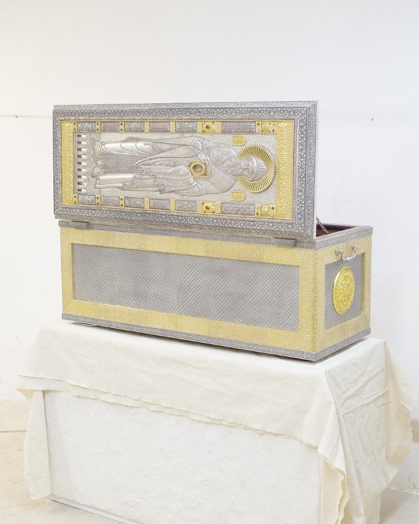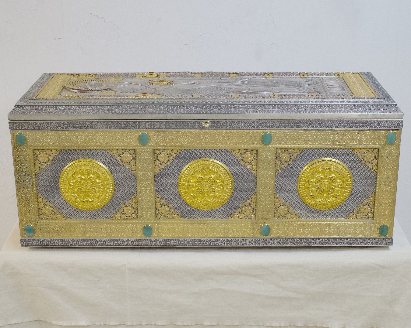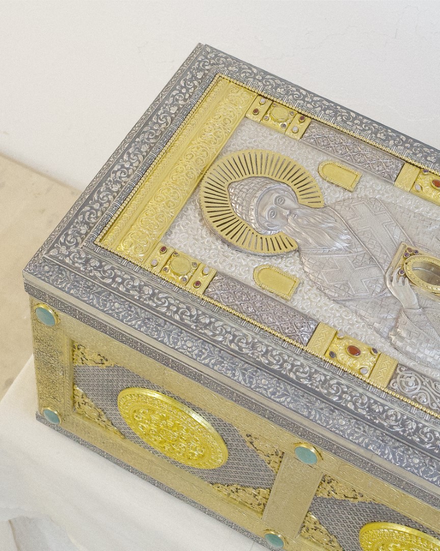 Рака изготовлена из массива сосны, декорирована басмой из латуни и мельхиора, ручной резьбой, сусальной позолотой. Херувимы на сени - оловянное литье, накладки на раку в виде тропаря прп.Стефану - литье из бронзы. Сами мощи находятся под спудом, в раке - украшенная чеканным венцом и полудрагоценными камнями, икона преподобного. Как прообраз была взята рака прп. Василия Блаженного из собора в честь святого на красной площади.