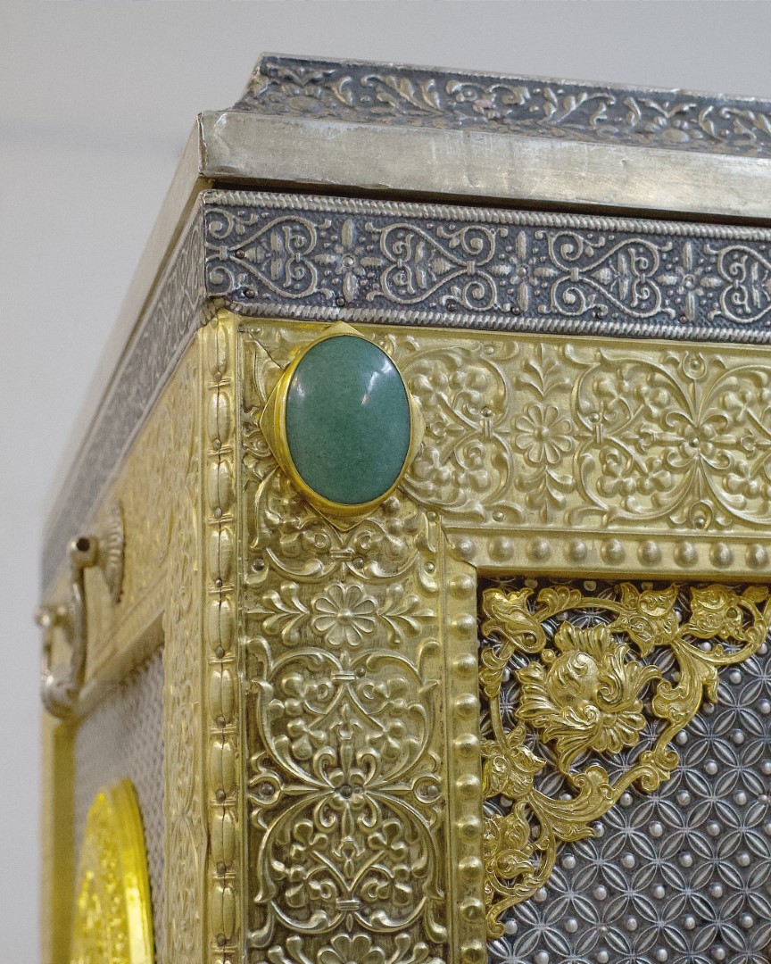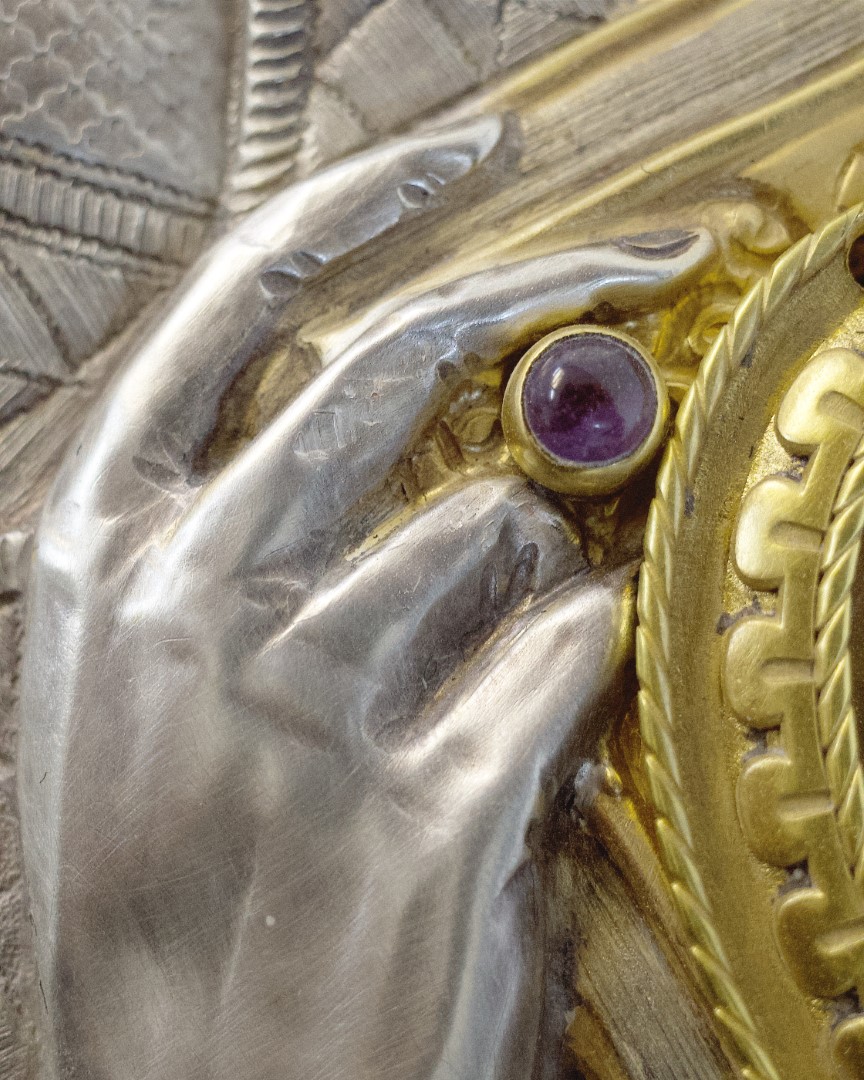 Оклад на на икону изготовлен из серебра, в различных ювелирных техниках. Сама риза - в технике гальванопластики. Венец, и элементы рамки иконы - чеканная работа. На фоне и рамке киота серебряная басма. Также для этой иконы были изготовлены специальные матрицы для табличек и надписаний сверху и снизу иконы. Венец украшен полудрагоценными камнями. Конструкция киота - спаяна из латуни, с последующим серебрением. Изготовление металлического киота дает удобную возможность брать икону из основного киота на крестный ход.